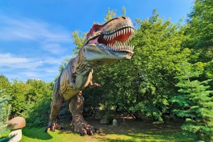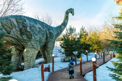 Дино-парковая зона в парке развлечений на Крылатской 18: фигуры динозавров, аттракционы и семейный отдых.