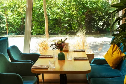 Кафе в районе Сокол с видом на зелень, меню для завтраков, обедов и вечеров-встреч, комфортно как для компании, так и для отдыха.