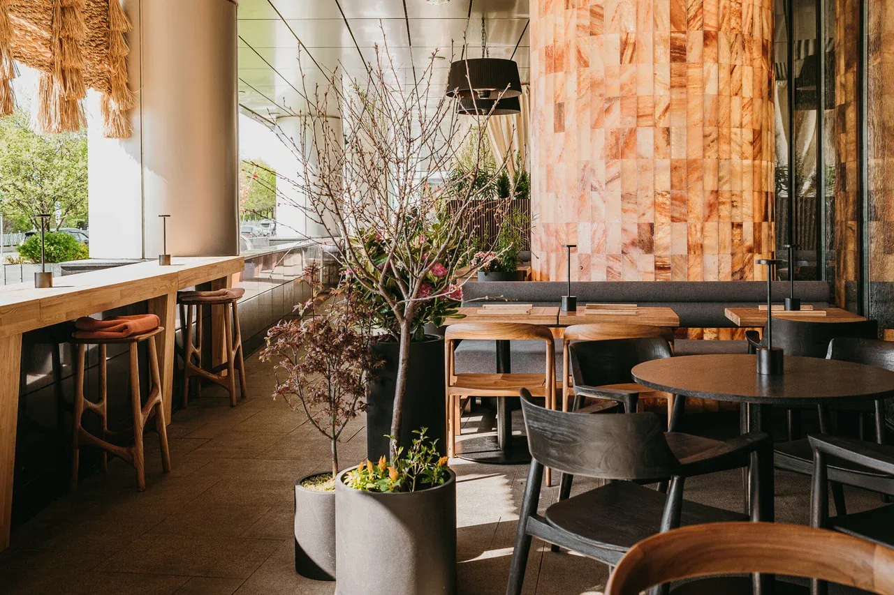 Японский ресторан на Цветном бульваре с открытой кухней, грилем, сашими, стейками и интерьером в янтарных оттенках.