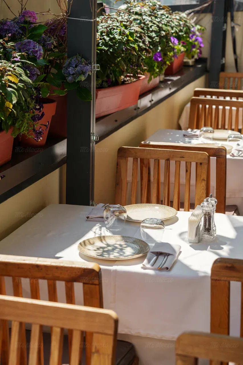 Летом работают две террасы: одна выходит на Арбат, другая располагается на балконе особняка — уютное место для вечернего ужина с видом на город. В меню бара — вино, коктейли, чай и авторские напитки, вдохновлённые восточными рецептами.