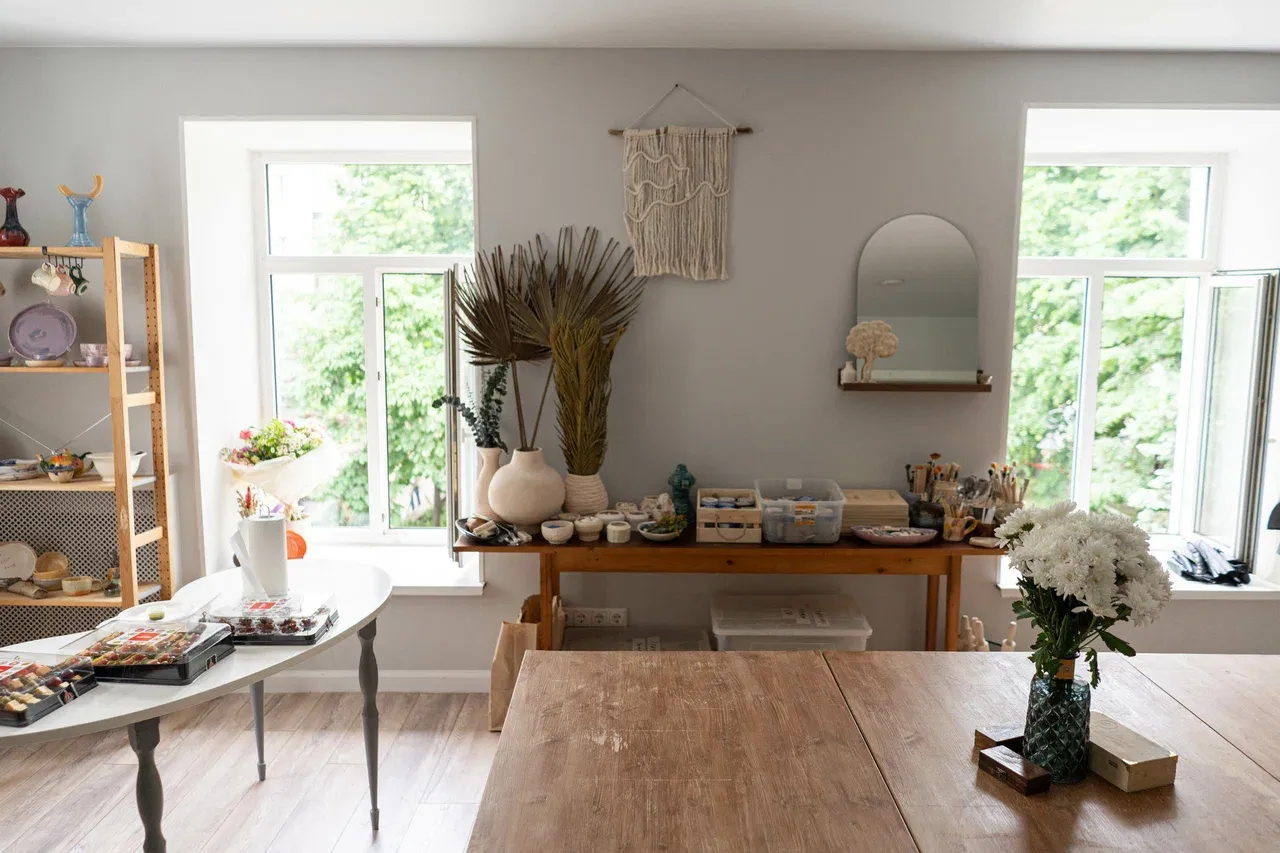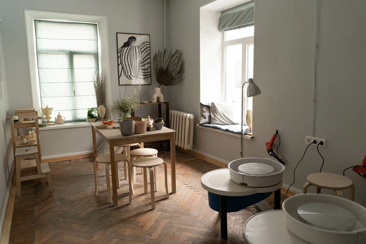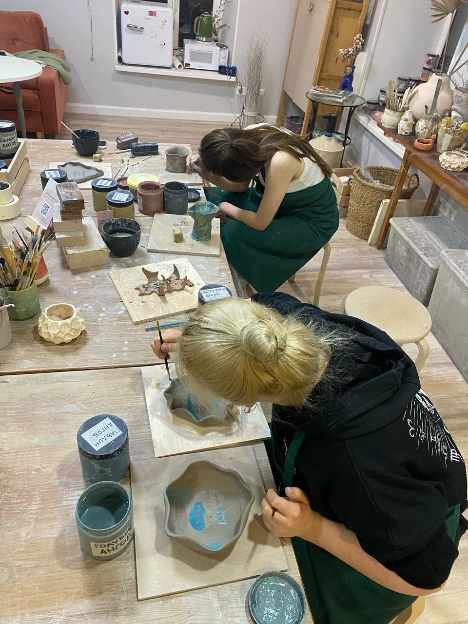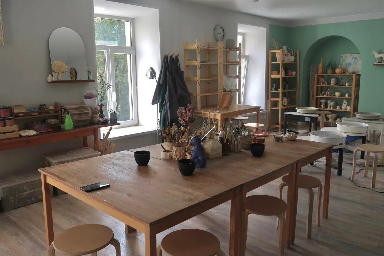Интерьер студии выдержан в комфортном, вдохновляющем ключе: светлое помещение, столы с инструментами, полки с образцами готовых работ, зона отдыха где после литья и лепки можно сделать паузу, выпить чай, обсудить результаты и просто побыть в моменте. После занятия изделие отправляется на обжиг, и спустя время вы получаете собственноручно созданную посуду или декоративный объект.