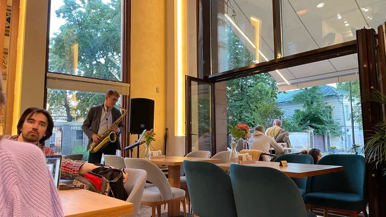 Ресторан открыт с раннего утра: здесь можно позавтракать ароматным кофе, круассанами или яичницей с овощами. В обед подают блюда бизнес-формата, а вечером атмосфера становится более камерной. Вечером ресторан наполняется светом, звуками музыки и лёгким шумом разговоров. В тёплое время года открывается небольшая терраса, где приятно проводить время на свежем воздухе.