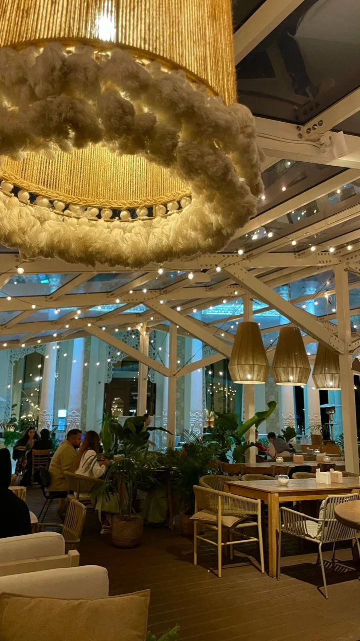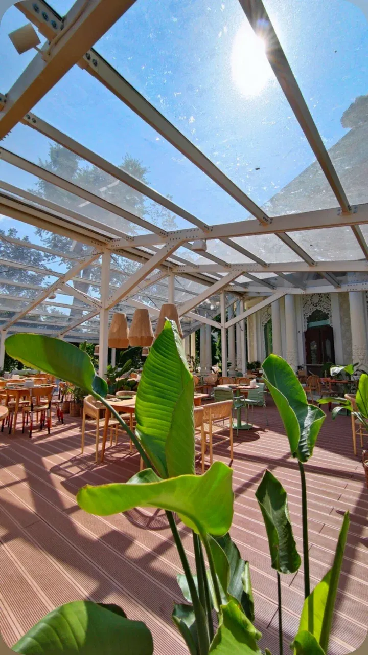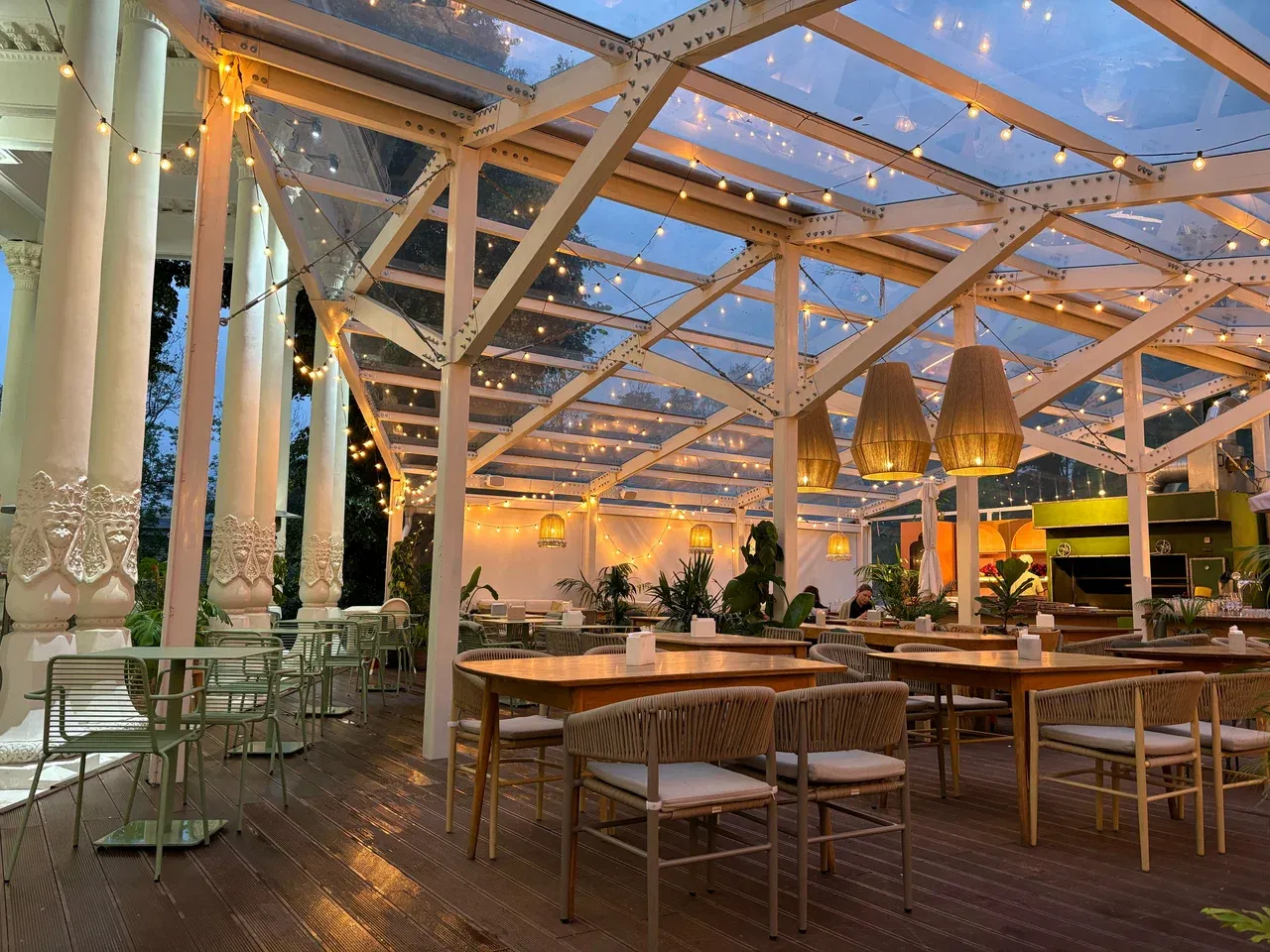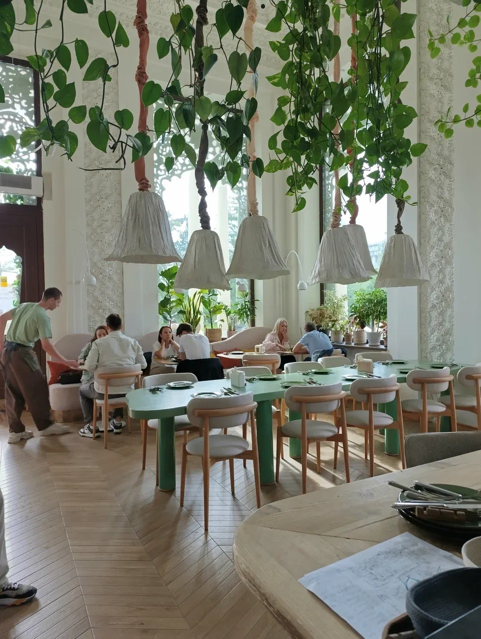 Интерьер стилизован под виллу: ажурные колонны, винтажные кресла, тропические растения, веранда в зелени и светлая мебель создают атмосферу отпуска внутри города. Меню ориентировано на натуральные ингредиенты и чистый состав — без фабричных соусов и усилителей.