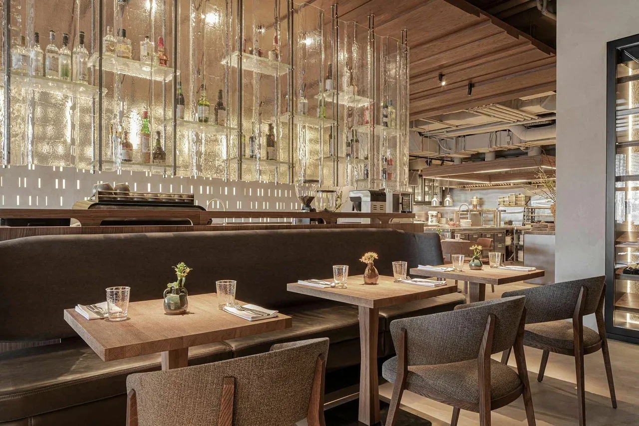 Интерьер ресторана поддерживает философию кухни — уютное, но стильное пространство с элементами этники и современного дизайна. Натуральное дерево, фактурные стены, зелёные акценты, мягкий свет и открытая кухня создают атмосферу уюта и живого общения. Зал поделен на зоны: просторная основная часть, камерные столики для ужина вдвоём и отдельные пространства для компаний.