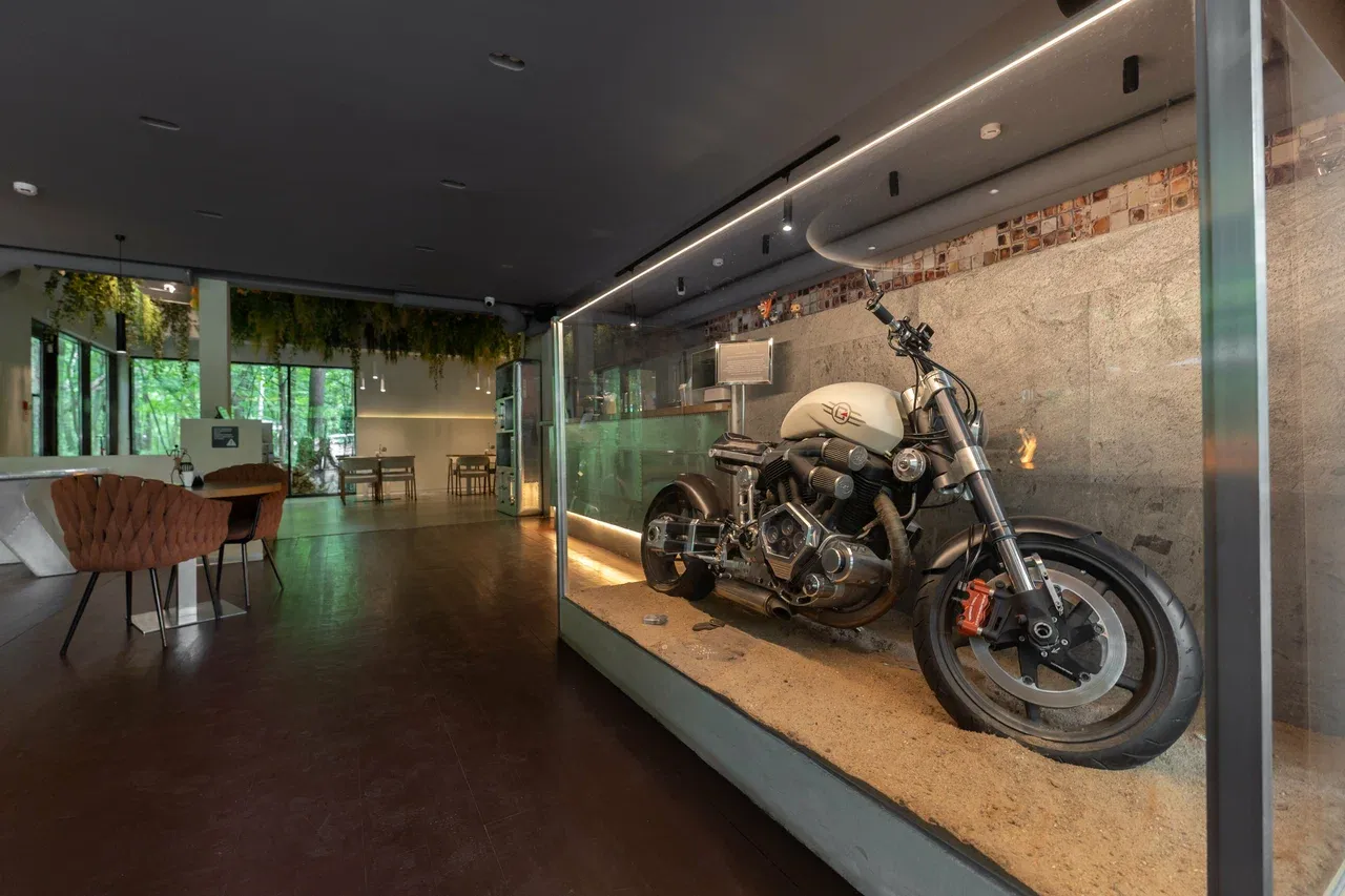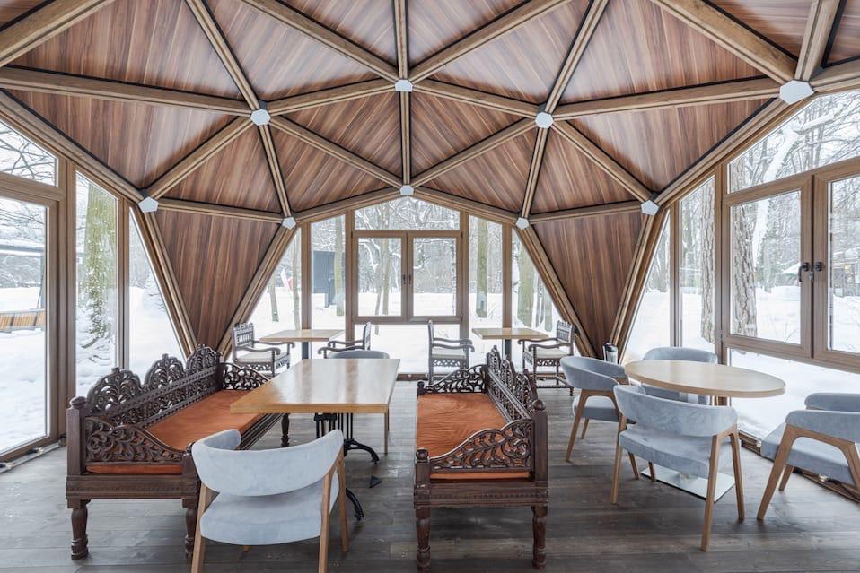 Интерьер выполнен в природных оттенках: дерево, мягкий свет, живая зелень, панорамные окна. Центральная часть зала — каминная зона, создающая ощущение уюта и тепла. В тёплый сезон работает просторная веранда с видом на зелёный двор, где можно пообедать или провести вечер с друзьями.