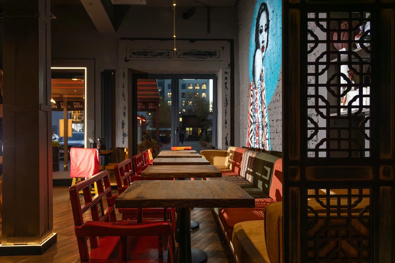Интерьер создаёт идиллию: просторный зал промышленной эстетики с кирпичными стенами, граффити и зелёными акцентами, куда органично вписана летняя веранда. Зона открыта и дружелюбна, сюда удобно зайти компанией или одному — команда работает так, как будто ты пришёл в гости к друзьям. Меню сочетает классику и авторские интерпретации: вок-блюда с рисом или лапшой, морепродукты и овощи в азиатском стиле, пельмени-гёдза, знаменитая утка по-пекински — всё приготовлено с акцентом на щедрую порцию и насыщенный вкус.