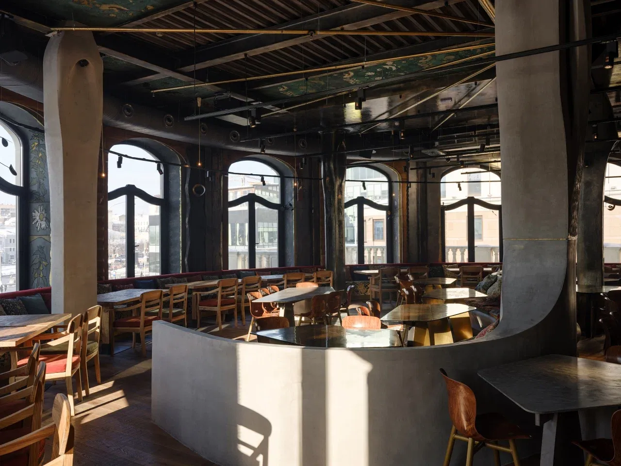 В центре Москвы, в историческом здании бывшего Центрального рынка, работает ресторан, построенный вокруг идеи открытого огня. Основу пространства составляют большие печи, хосперы и смокеры, которые видно прямо из зала. Формат построен так, чтобы процесс приготовления стал частью впечатления: жар, дым, огонь и движение кухни создают ощущение живого пространства.
