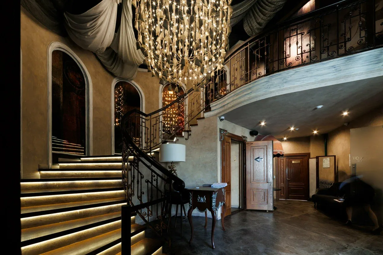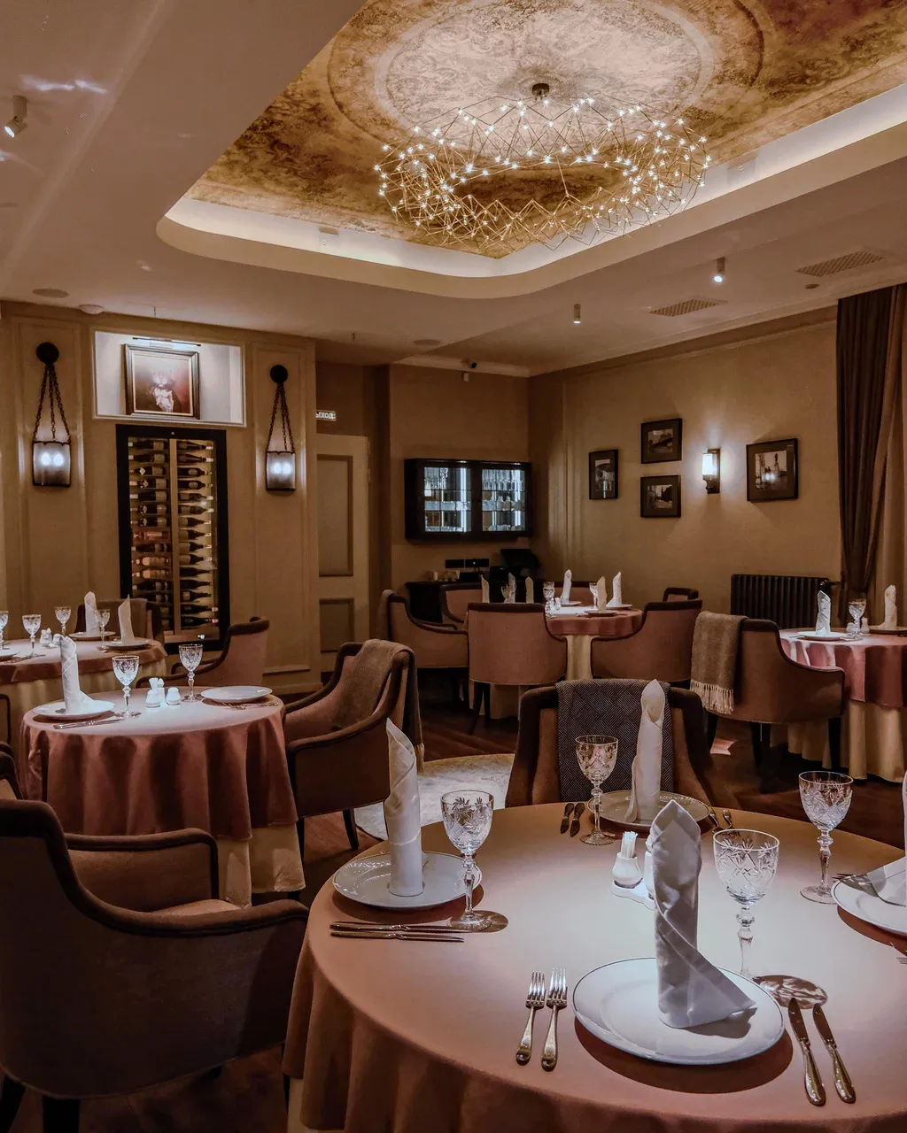 Интерьер сочетает классику и легкую театральность: массивные деревянные элементы, приглушённый свет, высокие потолки и детали, отсылающие к культурной Москве. Пространство камерное, но при этом просторное — подходит как для спокойного обеда, так и для праздничного ужина.