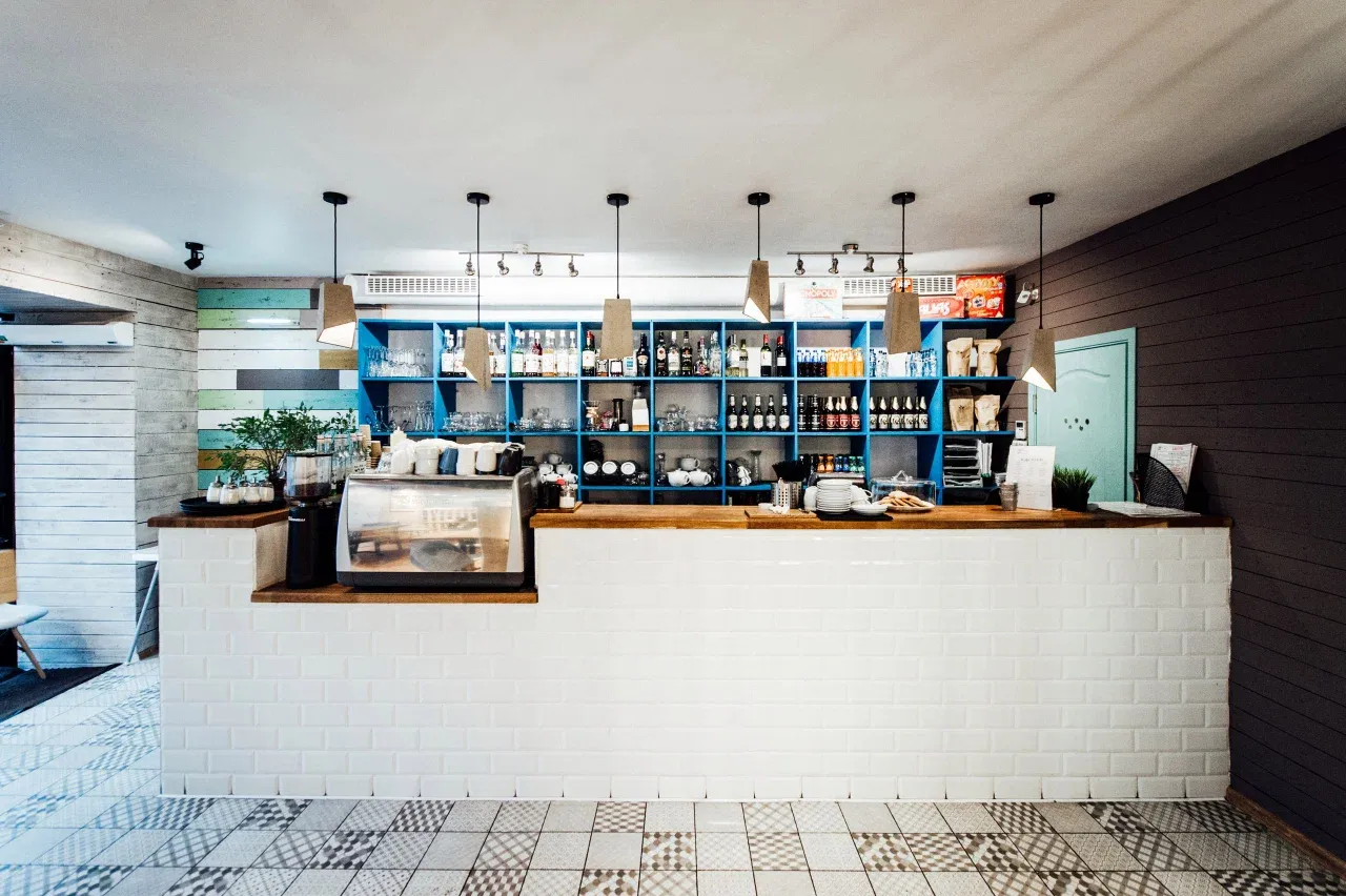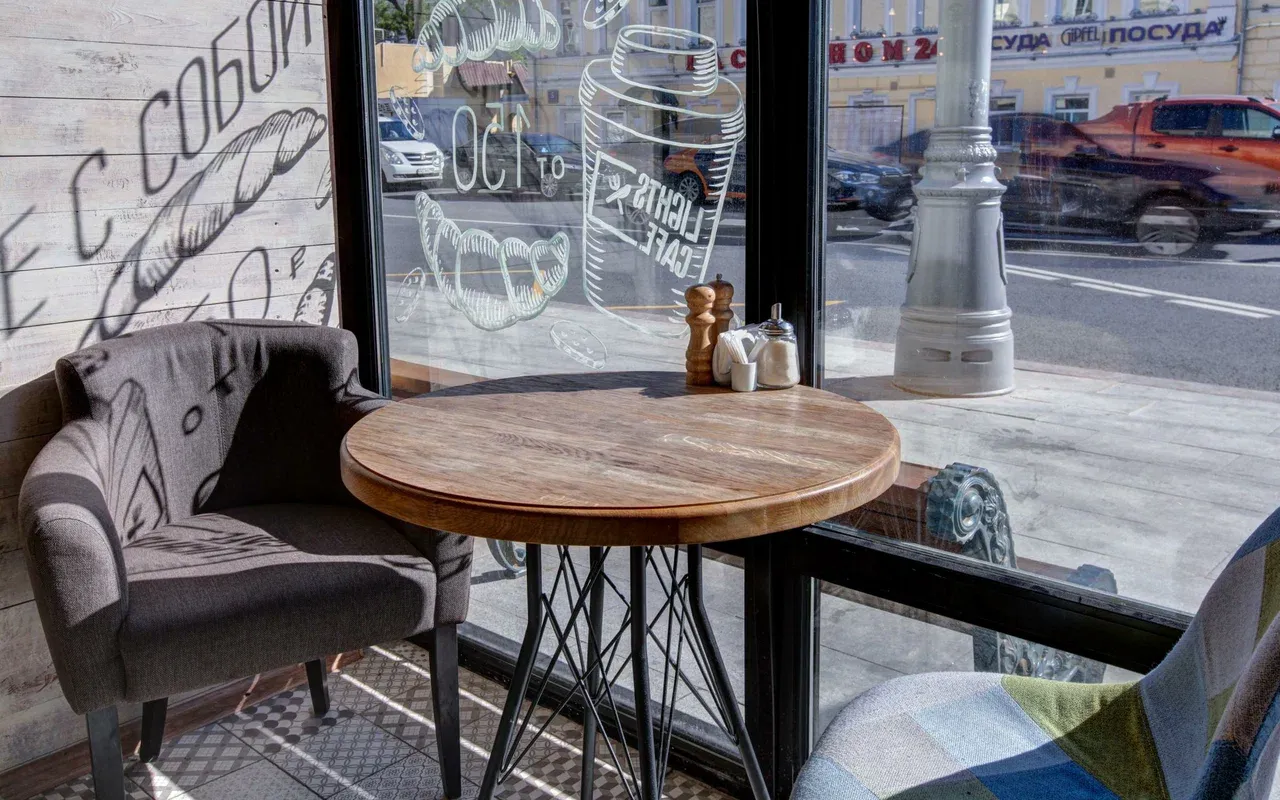 Внутри пространство оформлено в стиле современного кафе: светлые стены, деревянные и металлические акценты, большие окна, приглушённое освещение вечером. Столы расположены удобно как для одиночного визита с ноутбуком или кофе, так и для компании друзей. Есть зоны с диванами, есть места у окна — выбор зависит от настроения.