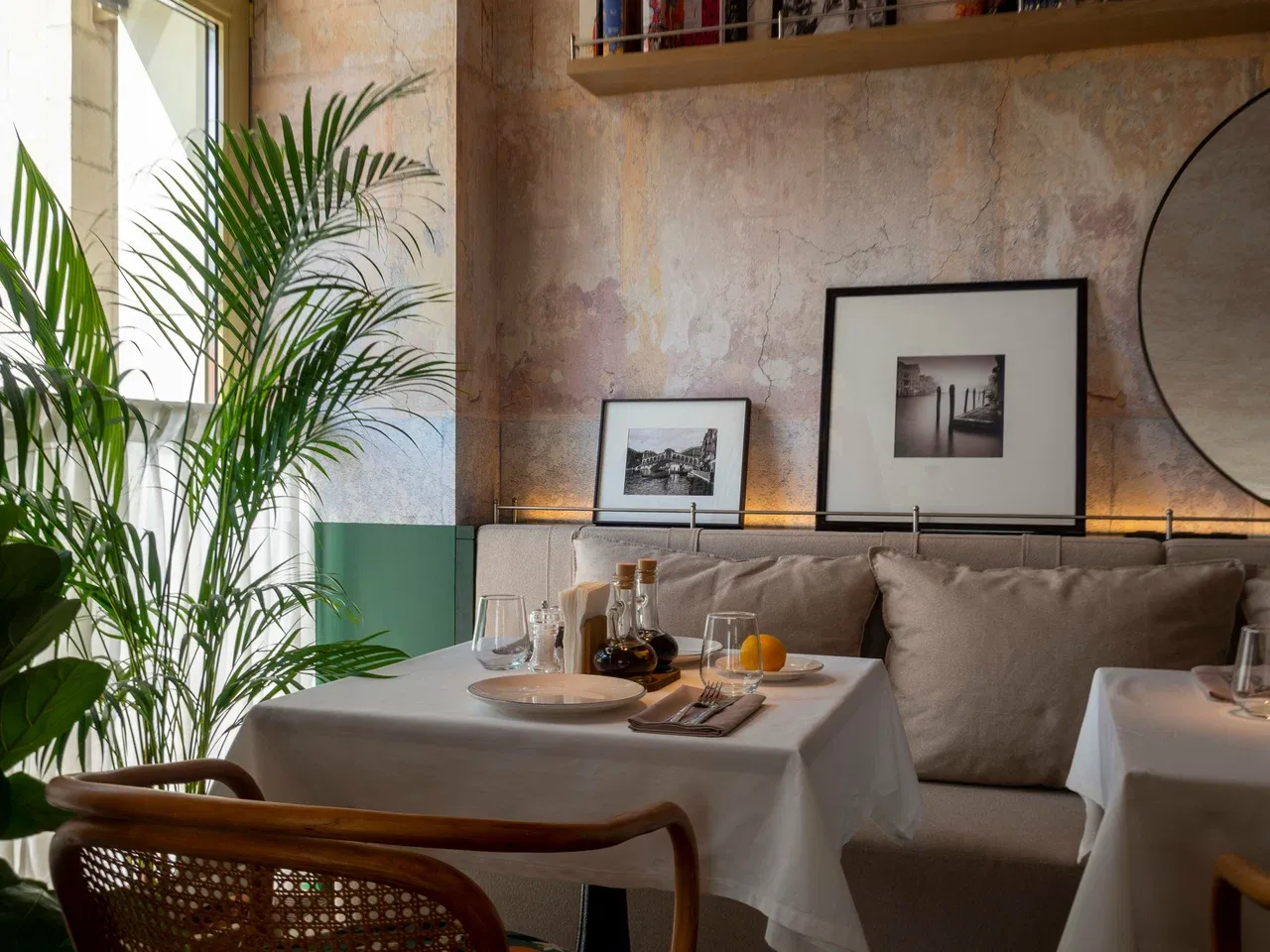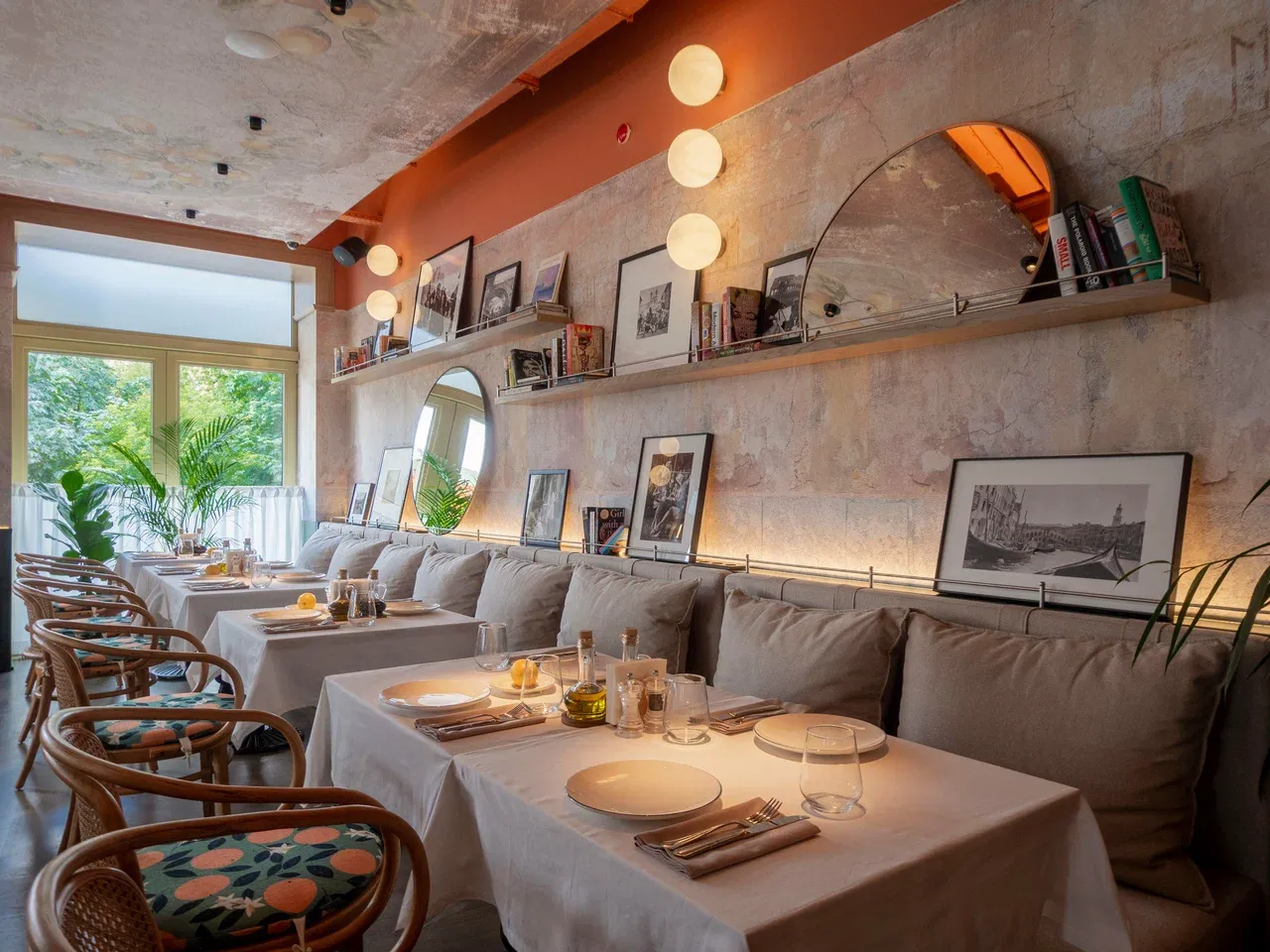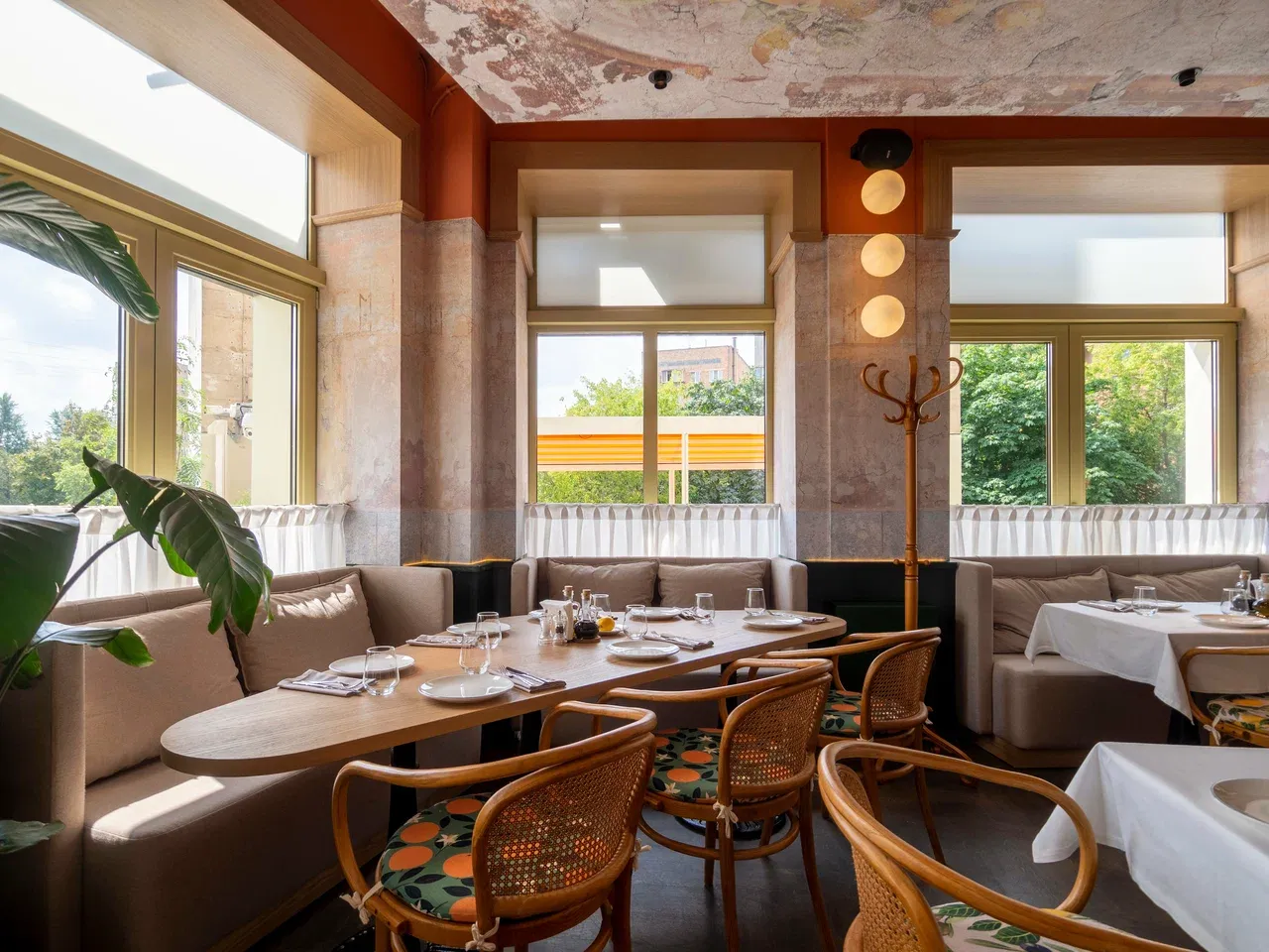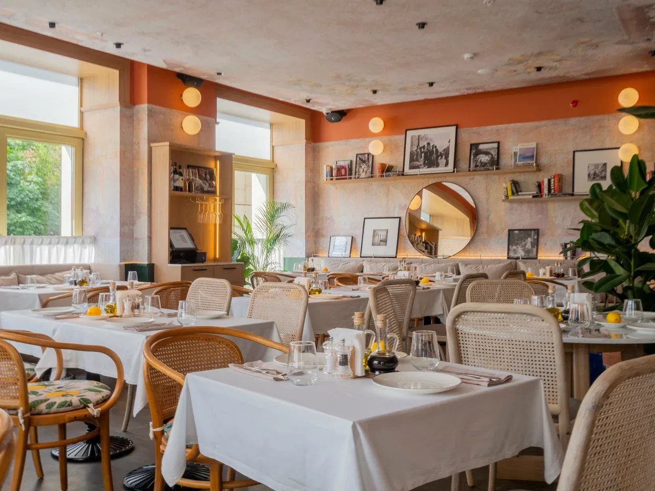 В ресторане два зала и летняя веранда с видом на улицу. В основном зале удобно проводить встречи и семейные праздники, а на веранде можно насладиться ужином в тёплое время года. Пространство подходит как для больших компаний, так и для уединённых вечеров.