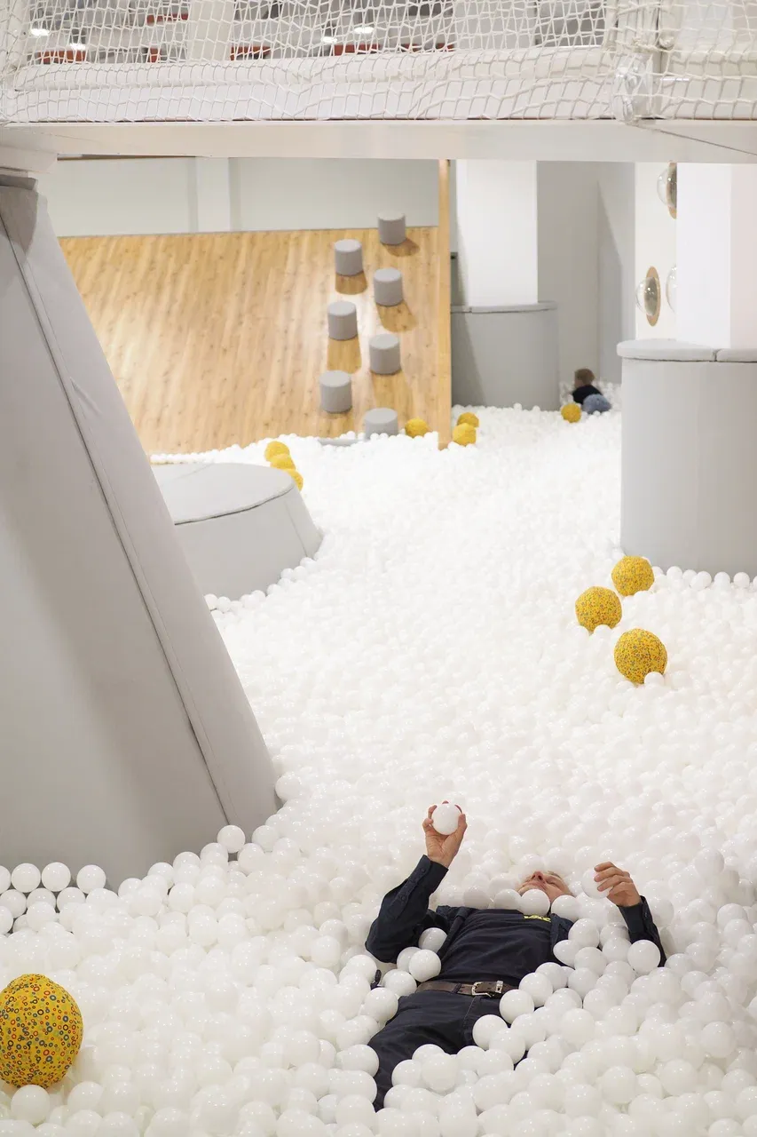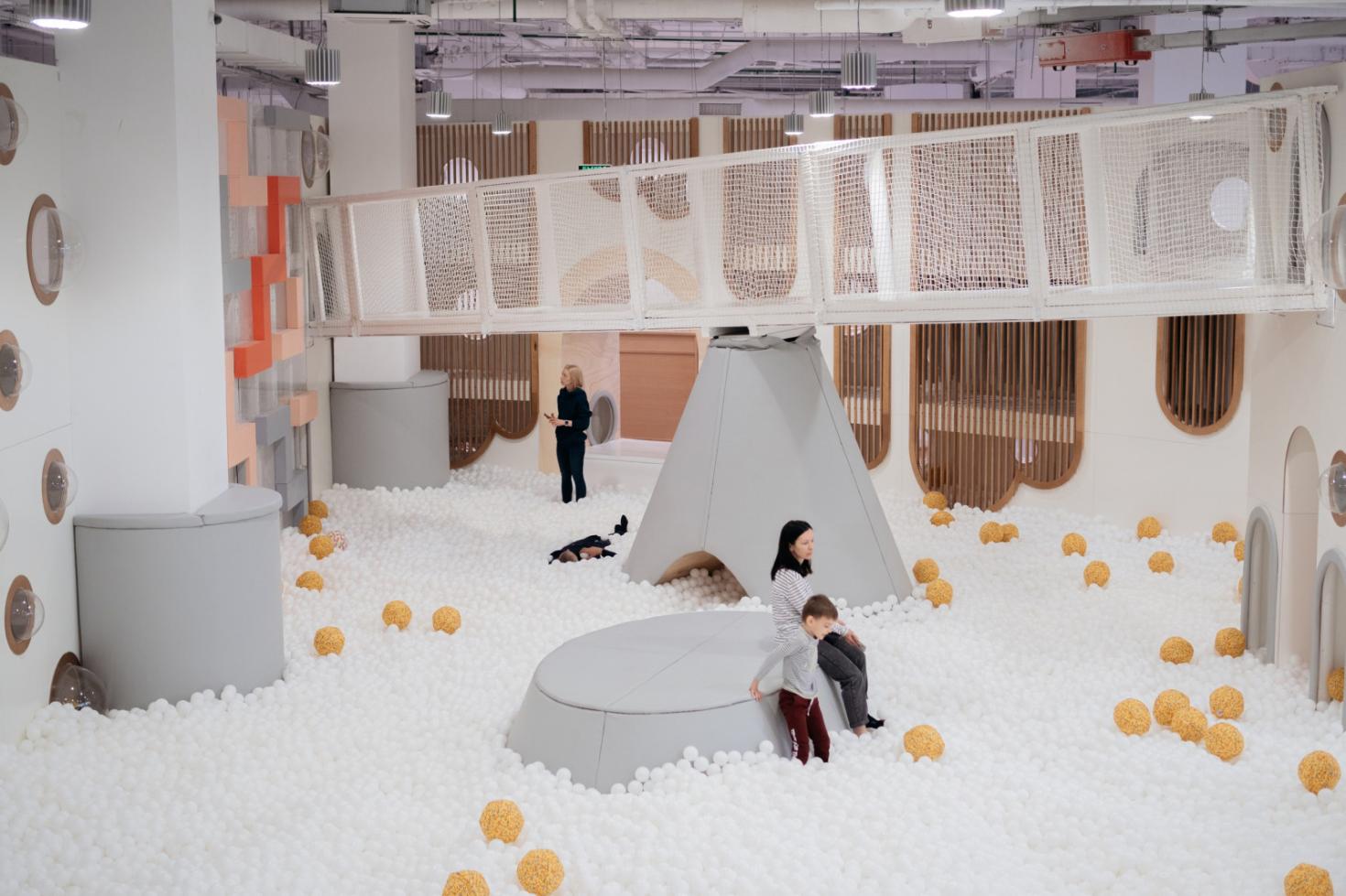 Интерьер продуман так, чтобы обеспечить свободу действий и безопасность. Предусмотрены зоны для сенсорного развития, например крупная песочница с экологичными игрушками, сухой бассейн с шариками, игровые лабиринты и скользящие площадки. Эти блоки соединены так, чтобы ребёнок мог перемещаться между ними и сам выбирать активность.