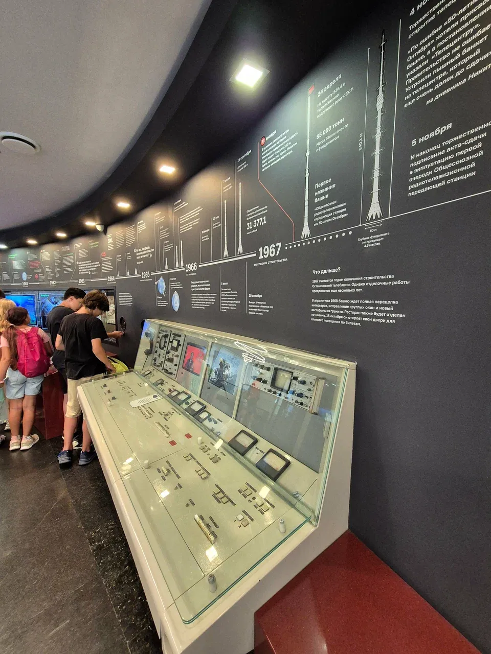 Посетителей встречает современный входной комплекс с выставкой о строительстве и истории башни. После регистрации гости проходят зону интерактивных экспозиций, где можно узнать, как башня была возведена, какие технологии использовались и какую роль она играет в телевещании и радиосвязи.