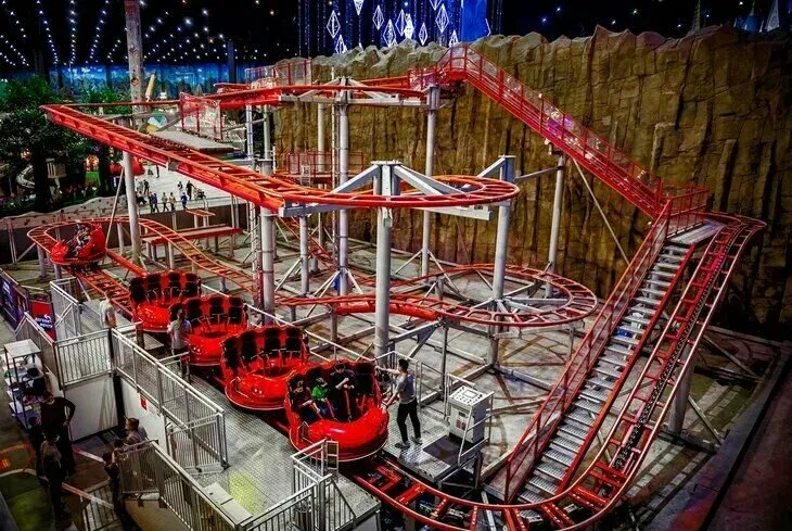 Когда переступаешь вход в локацию на проспекте Андропова, ощущаешь, что попал в пространство, где развлечения и технологии соединяются — здесь находится крупный крытый парк аттракционов с десятками зон, из которых можно выбрать активность на любой вкус. Первые шаги — это прогулка по огромному залу, где витрины, вывески и масштаб создают ощущение города-внутри. В одной части можно увидеть тематические локации с персонажами, например черепашками-ниндзя или Hello Kitty, и погрузиться в атмосферу сказки, а в другой — выбрать рок-полёт на американских горках или острые ощущения на многометровом маятнике.