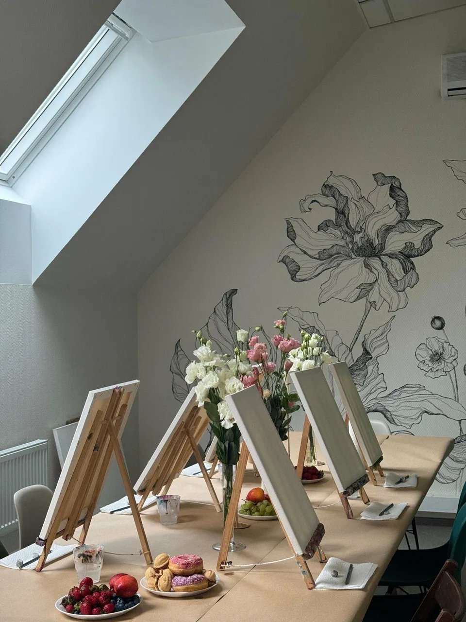 В центре Москвы, в двух шагах от метро Новослободская, расположена арт-студия, созданная для того, чтобы творчество стало поводом просто провести время, а не обязательной задачей. В пространстве царит расслабляющая атмосфера: ощущается свобода, даже если кисть у вас в руках впервые. Зал стилизован как лофт-версия домашней мастерской: стены с текстурой, натуральное дерево, свет, необходимый для живописи, молберты и удобные кресла — всё располагает к тому, чтобы забыть о рутине и сделать шаг навстречу своему хобби.