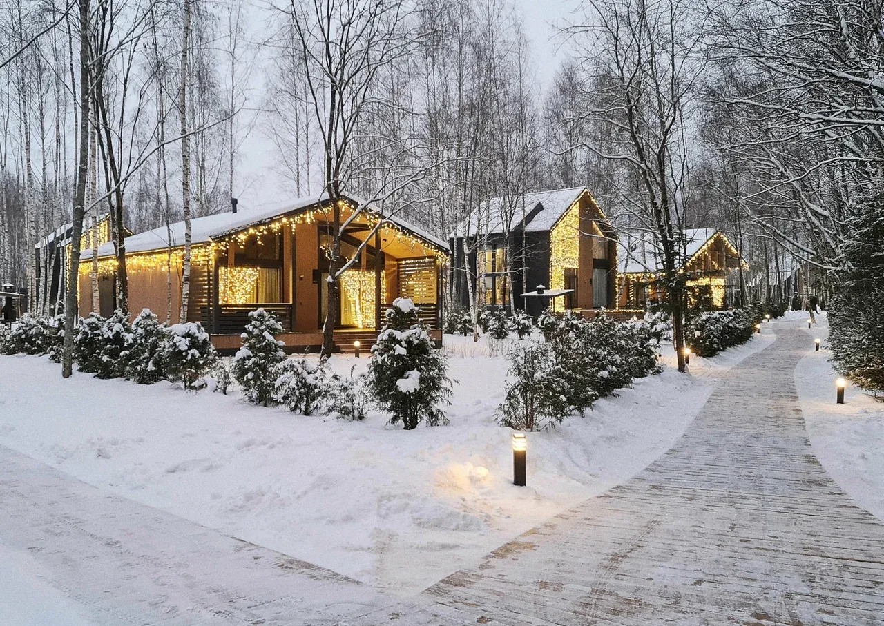 Гостям доступны коттеджи разных форматов — от уютных одноэтажных домов до просторных двухэтажных вилл с панорамными окнами и террасами. В каждом домике есть кухня, санузел, каминная зона и мебель для отдыха на веранде. Для тех, кто ищет приватность, предусмотрены коттеджи с отдельными банями и мангальными площадками.