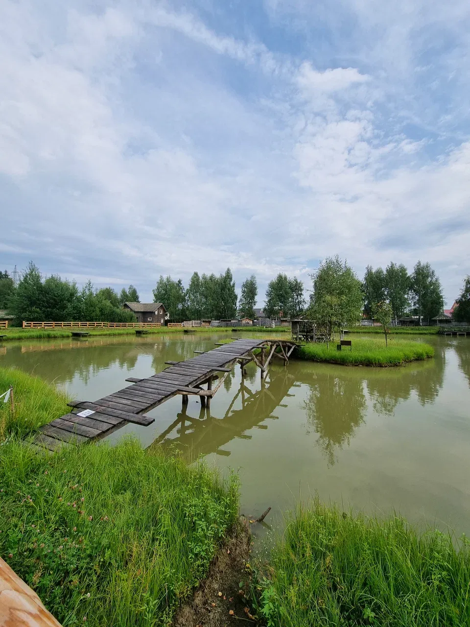 На территории — пруд, где в тёплый сезон можно купаться или ловить рыбу на рассвете. Лёгкий туман над водой, звуки природы и отражение деревьев в глади — всё это создаёт расслабляющее настроение для отдыха вдалеке от городской суеты.