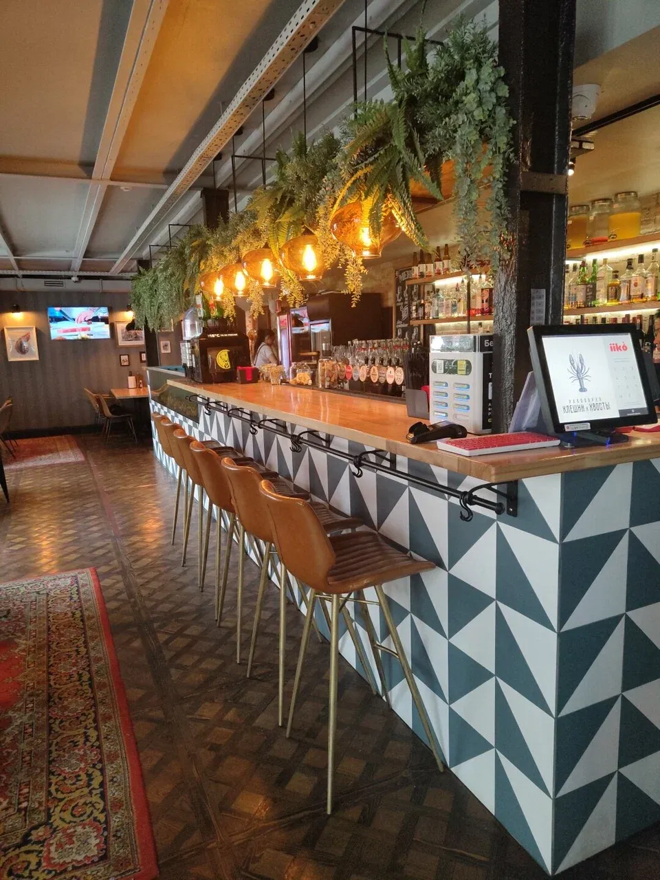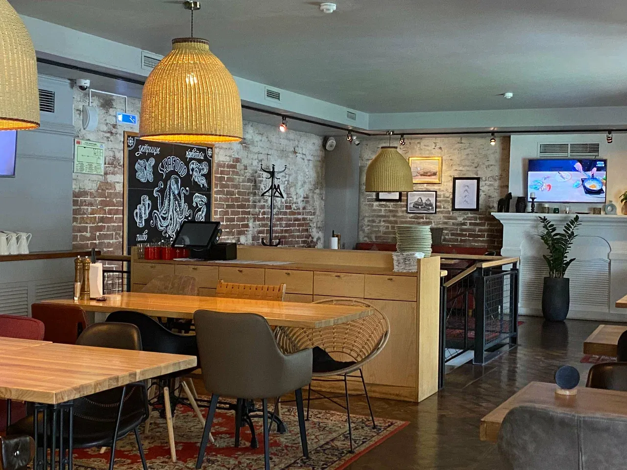 Интерьер ближе к индустриальному стилю: комбинированные поверхности, светлое дерево, металл, удобные кресла — всё без излишней помпезности, но с комфортом. Отдельные зоны рассчитаны на группы и компании, также подходит для семейного визита или встречи с друзьями.