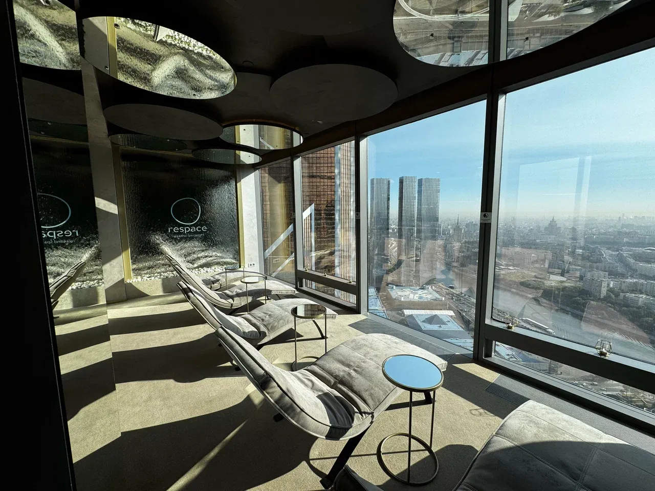 Интерьер Respace выполнен в современном минимализме с мягким светом, натуральными материалами и большими окнами, через которые открываются впечатляющие виды Москвы. Это не просто место для ухода за собой, а пространство для полной перезагрузки.