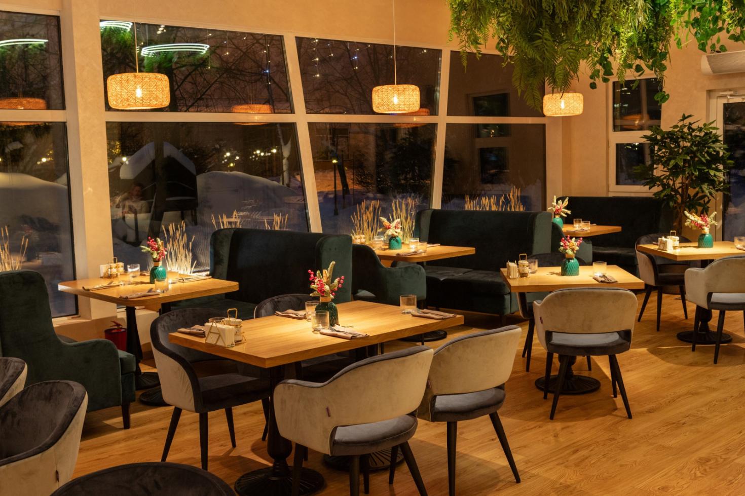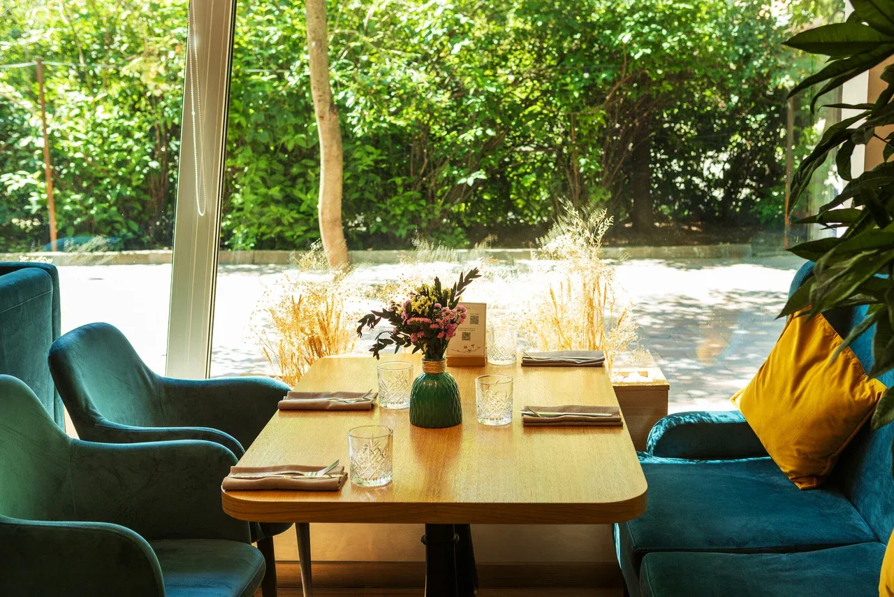 Меню подчёркивает комфорт и разнообразие: лёгкие закуски, свежие салаты, домашняя паста и рыба, интересный выбор десертов и напитков. Утренние часы подходят для кофе-релакса, в обед можно заглянуть на сет-меню, а вечером — устроиться с бокалом вина или коктейлем. Интерьер удачно сочетает современность и тепло: дерево, натуральные материалы, зелень и вид на улицу создают лёгкий курортный эффект внутри города.