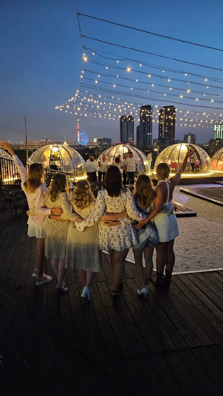 Одно из ключевых преимуществ — выход на панорамную веранду, с которой открывается обзор на город и крыши Москвы. Это добавляет эффекта масштаба и особой атмосферы. Пакетные предложения включают торжества вроде дней рождения, свадеб, девичников, фотосессий и корпоративов.