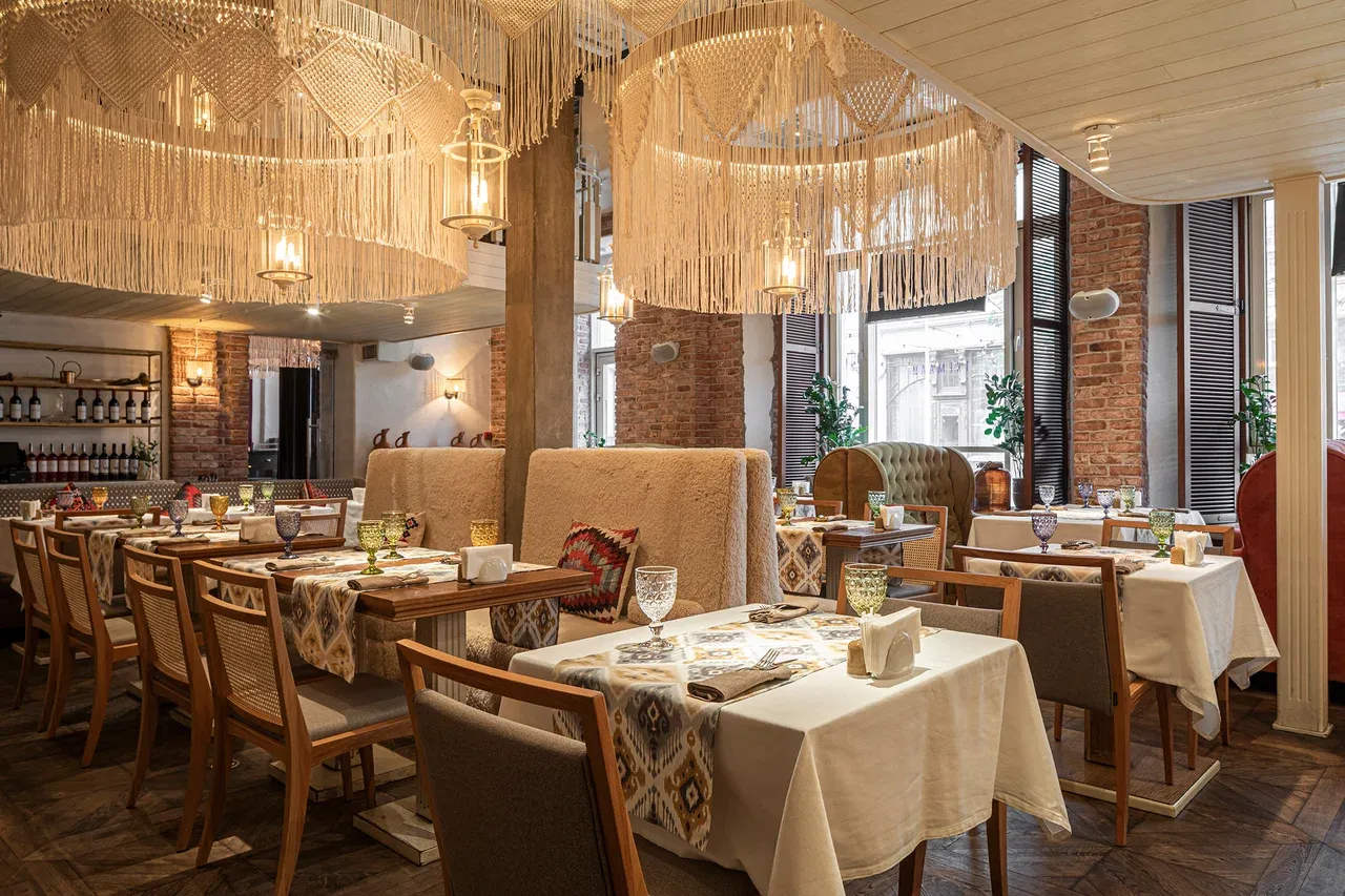 Интерьер передаёт атмосферу настоящего тбилисского дома — тёплые оттенки, камень, дерево, керамика и ручная роспись создают ощущение домашнего уюта и тепла. Вечером мягкий свет и грузинская музыка делают пространство особенно располагающим к неспешным беседам.