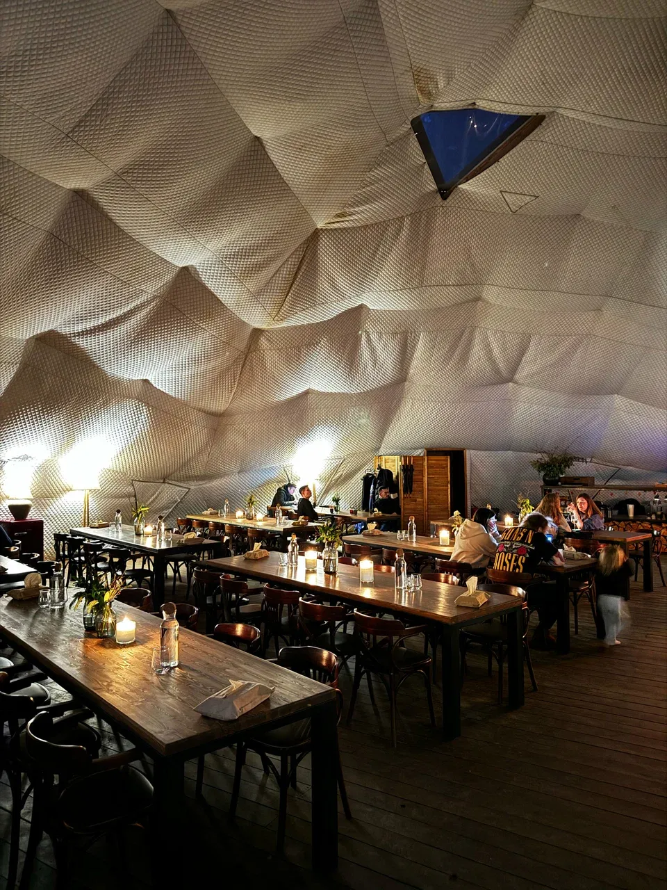 Жилой модуль выглядит как купол-домик с панорамными окнами, рассчитан на двоих, оснащён печкой-камином, горячим душем, санузлом и кондиционером. Веранда с шезлонгами ведёт прямо в лесную тишину — здесь можно сидеть, смотреть на закат или рассвет и чувствовать связь с природой.