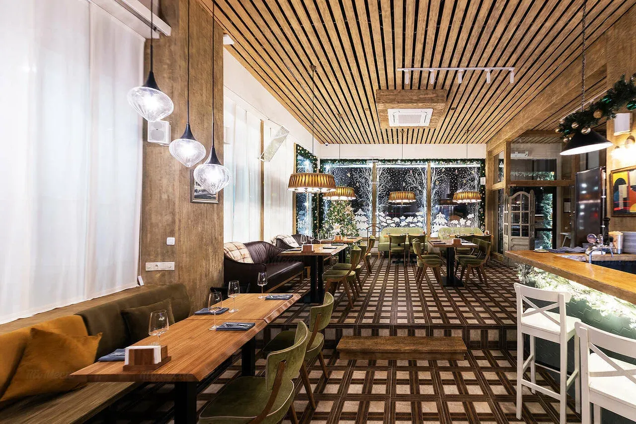 Уже приходя на территорию, обращаешь внимание на природу вокруг — ресторан расположен среди зелёных участков, вдали от городского шума. Внутренние залы оформлены элегантно и сдержанно: деревянные элементы, приглушенное освещение, уютные диваны и большие окна. Всё сделано так, чтобы ничто не отвлекало от общения, вкуса и атмосферы.