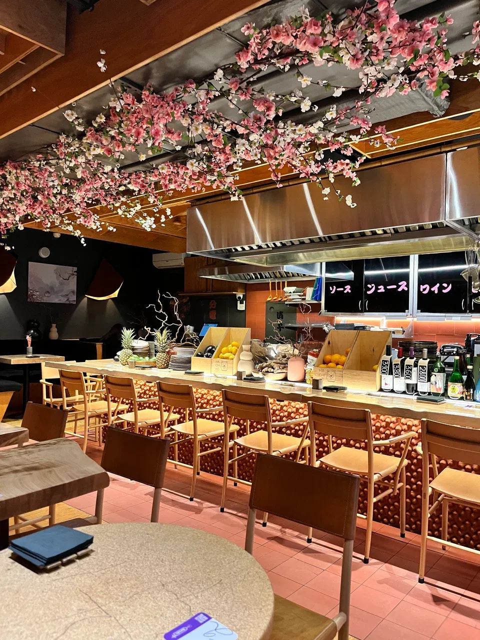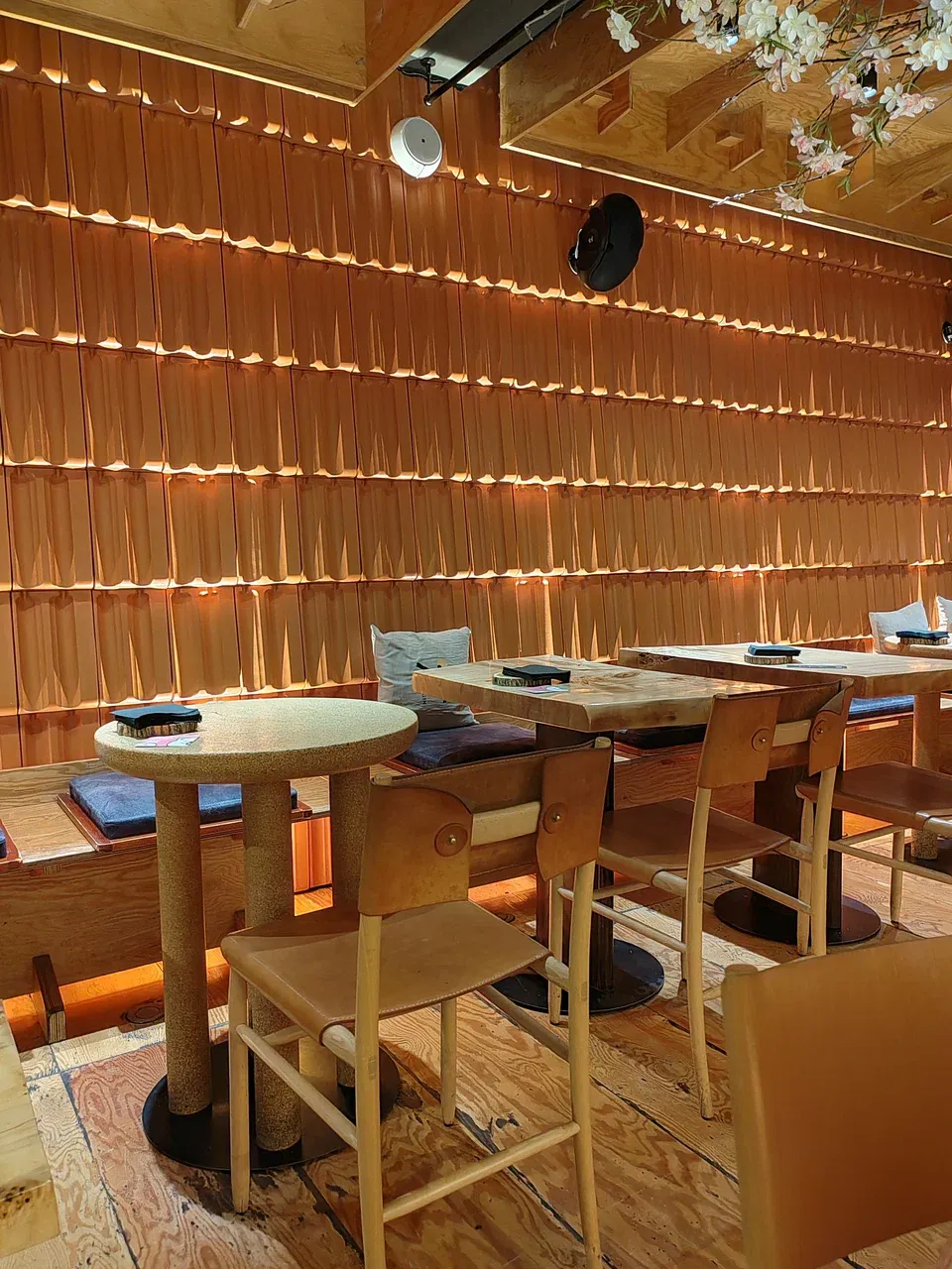 Интерьер выдержан в духе японской эстетики с современным подходом: массив дуба, кожа, традиционная черепица, минимализм в деталях, открытая гриль-кухня. На длинной барной стойке можно наблюдать, как на робата-гриле жарят морепродукты, мясо, овощи — процесс приготовления становится частью впечатления. Атмосфера дружелюбная, тёплая и расслабленная, словно вы пришли в гости к близким.