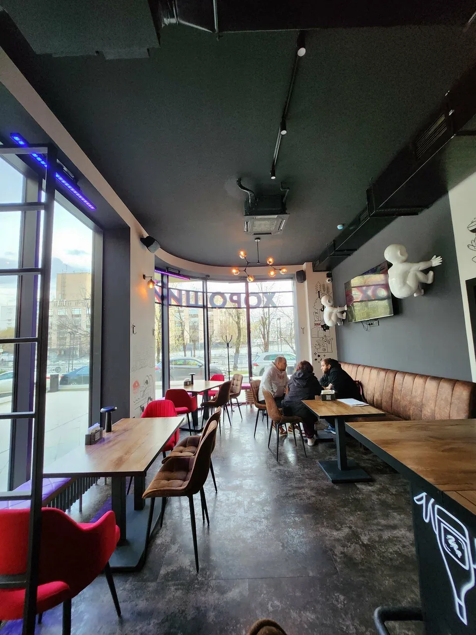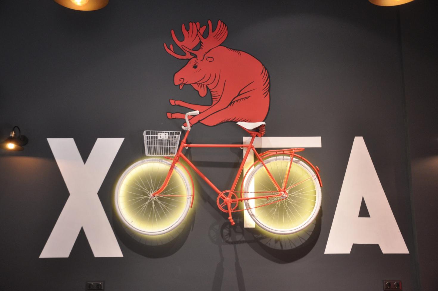 Интерьер выполнен в стиле современного бара-лофта: светлый зал с граффити на стенах, барная стойка с большим выбором разливного пива, удобные табуреты и столы, атмосфера расслабленной компании. В зале есть два экрана для спортивных трансляций, что подчеркивает ориентированность на компанию и эмоции.
