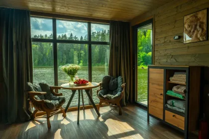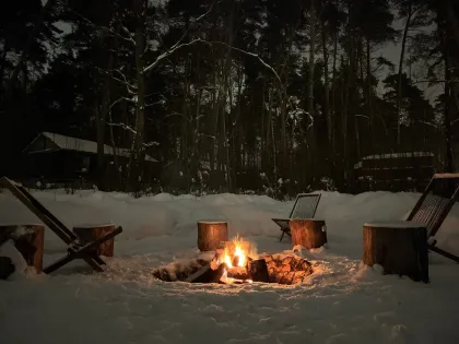База отдыха в Подмосковье с панорамными домиками у леса и реки, баней с купелями и спокойным отдыхом в часе от Москвы.
