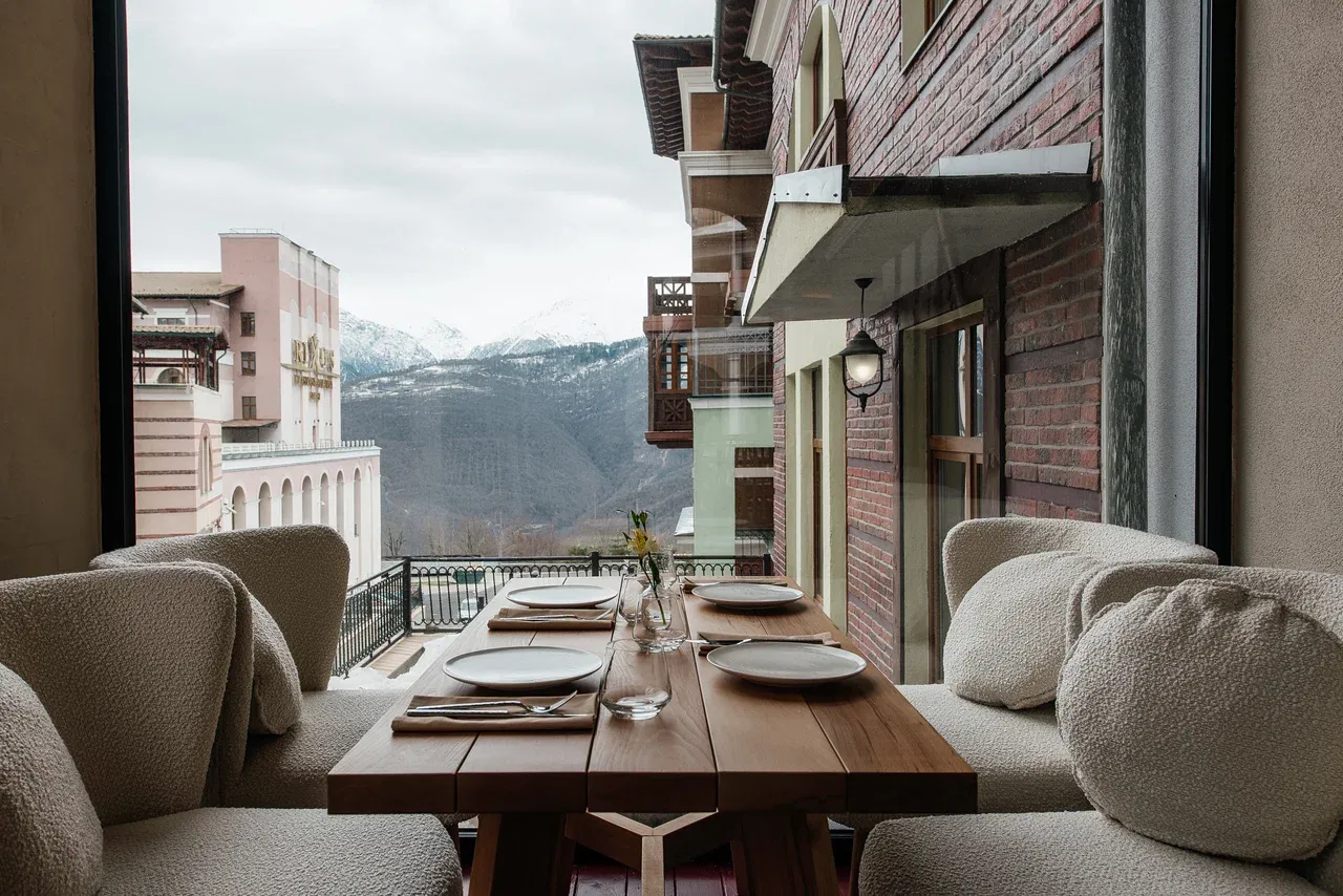 Сотерн — ресторан европейской и французской кухни, расположенный в горах среди вершин и лесов, где природа и гастрономия сливаются. Зал ресторана оформлен светлым деревом, панорамными окнами и элементами дизайна, напоминающими горное шале. Доминирующие мотивы — свет, воздух, минимализм и внимание к деталям: декоративные элементы, чистые линии, уютный камин создают атмосферу спокойствия и эстетики.