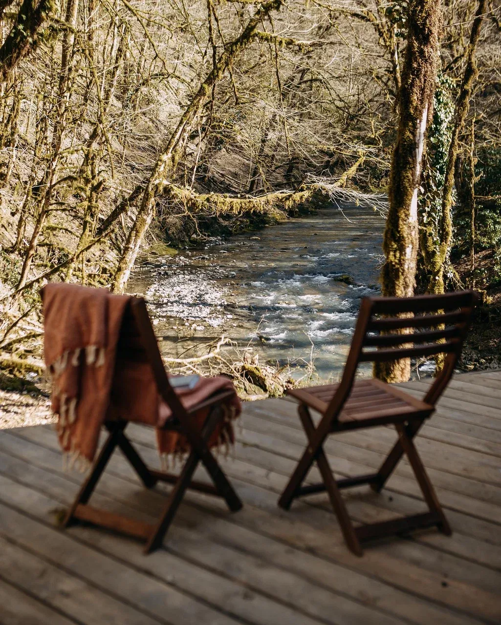 В инфраструктуре: баня-душ над рекой, чайная комната, общая зона с барной стойкой, где подают кофе, травяной чай, варенье, локальную еду и обеды-ужины “из-под ножа”. Утром подают завтрак, есть трёхразовое питание при бронировании соответствующего тарифа.