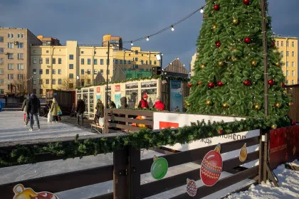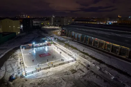 Открытый каток у Музея железных дорог в центре Петербурга: лед под открытым небом, прокат коньков, помощники, раздевалки и тёплая инфраструктура для семейного отдыха.