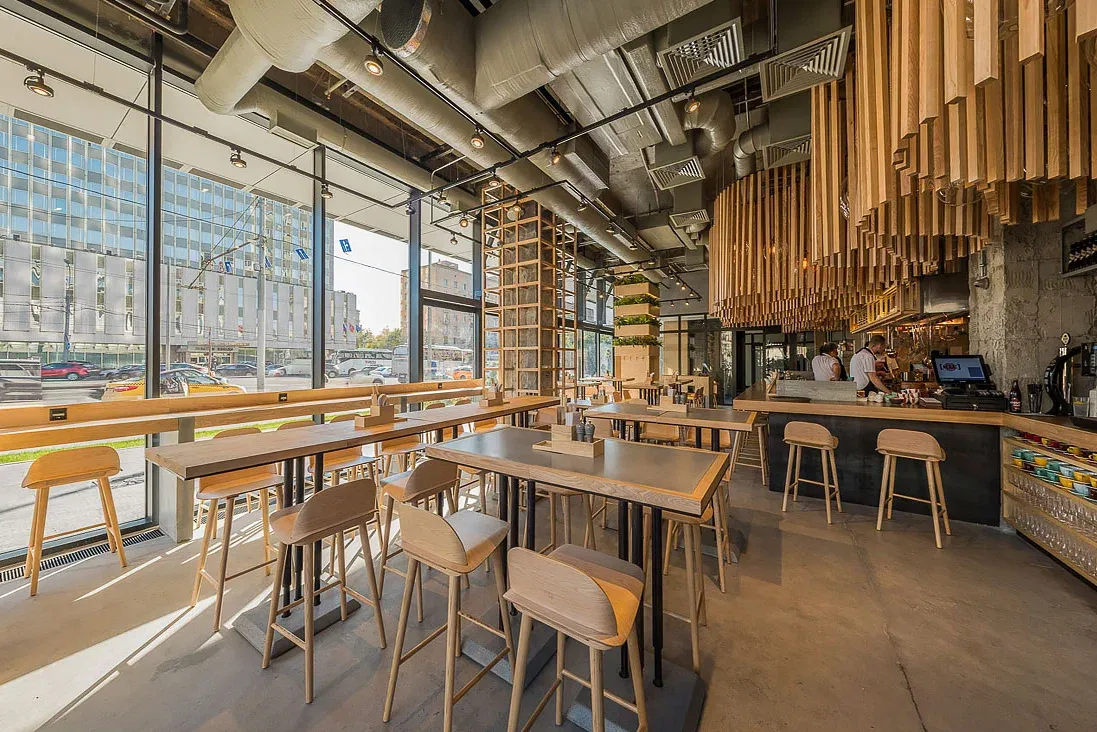 Интерьер минималистичный и тёплый: светлое дерево, открытая кухня, барная стойка и мягкое освещение создают ощущение уюта и живой гастрономии. В центре зала установлена noodle-машина, где готовят лапшу прямо при гостях — это часть концепции честной кухни и уважения к процессу. Заведение подходит для любого формата: можно заглянуть на быстрый обед, провести вечер за ужином или поработать с чашкой бульона.