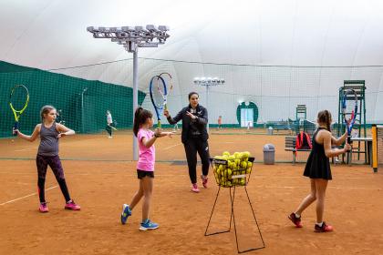 Занятия теннисом для всех уровней с профессиональными тренерами. Комфортные условия, раздевалки, сауна, хаммам и зона отдыха с кафе.